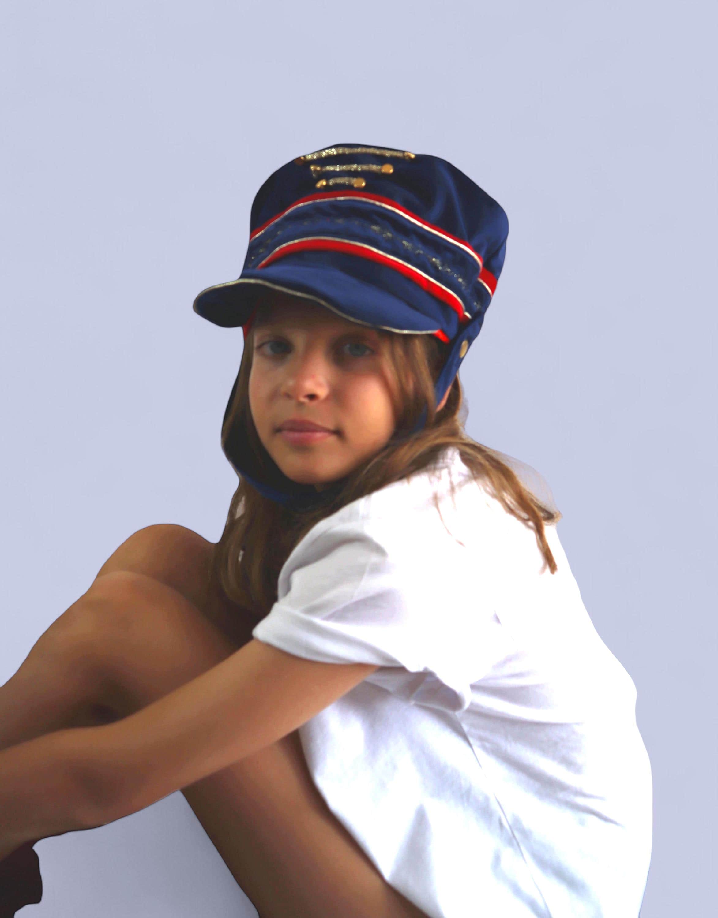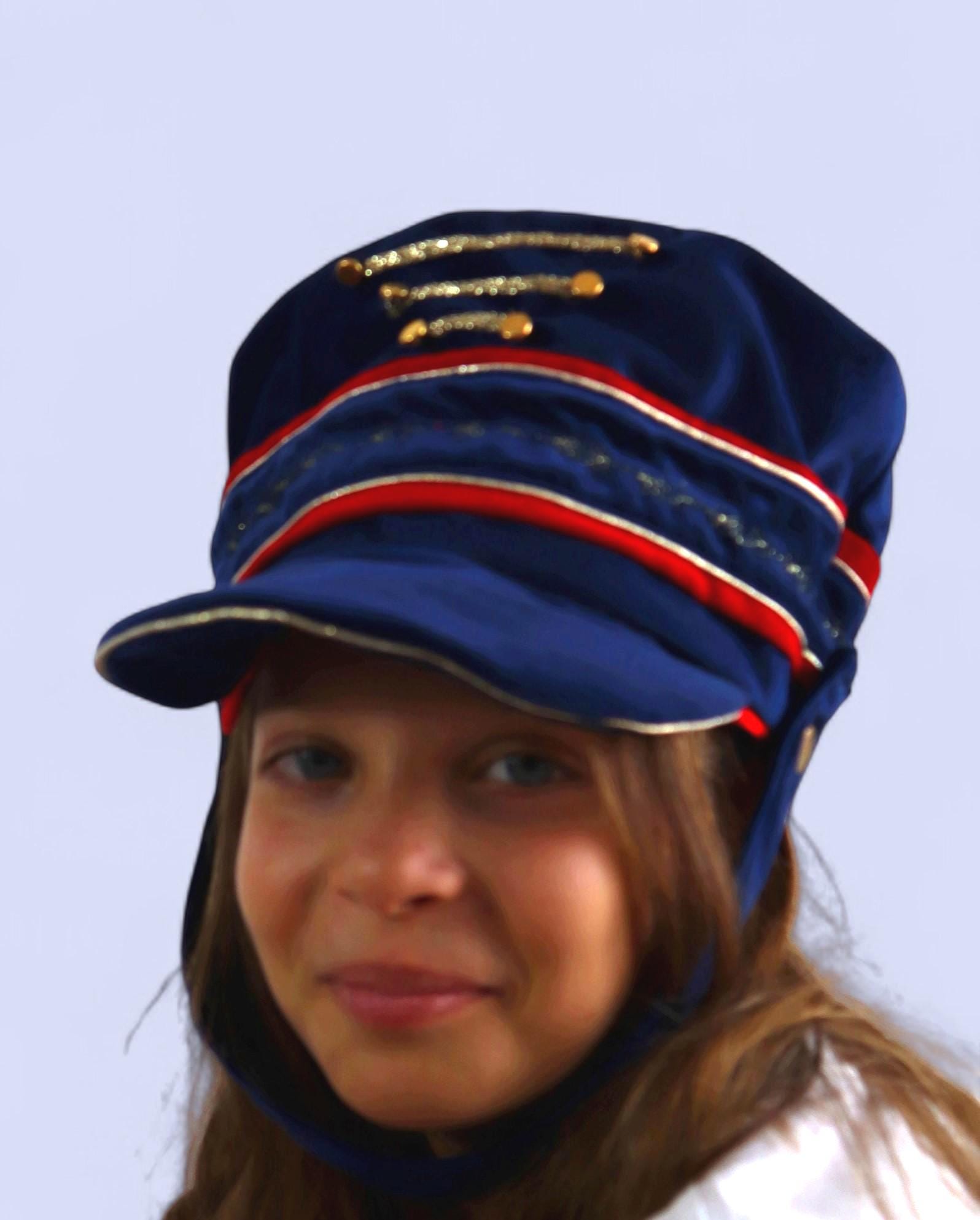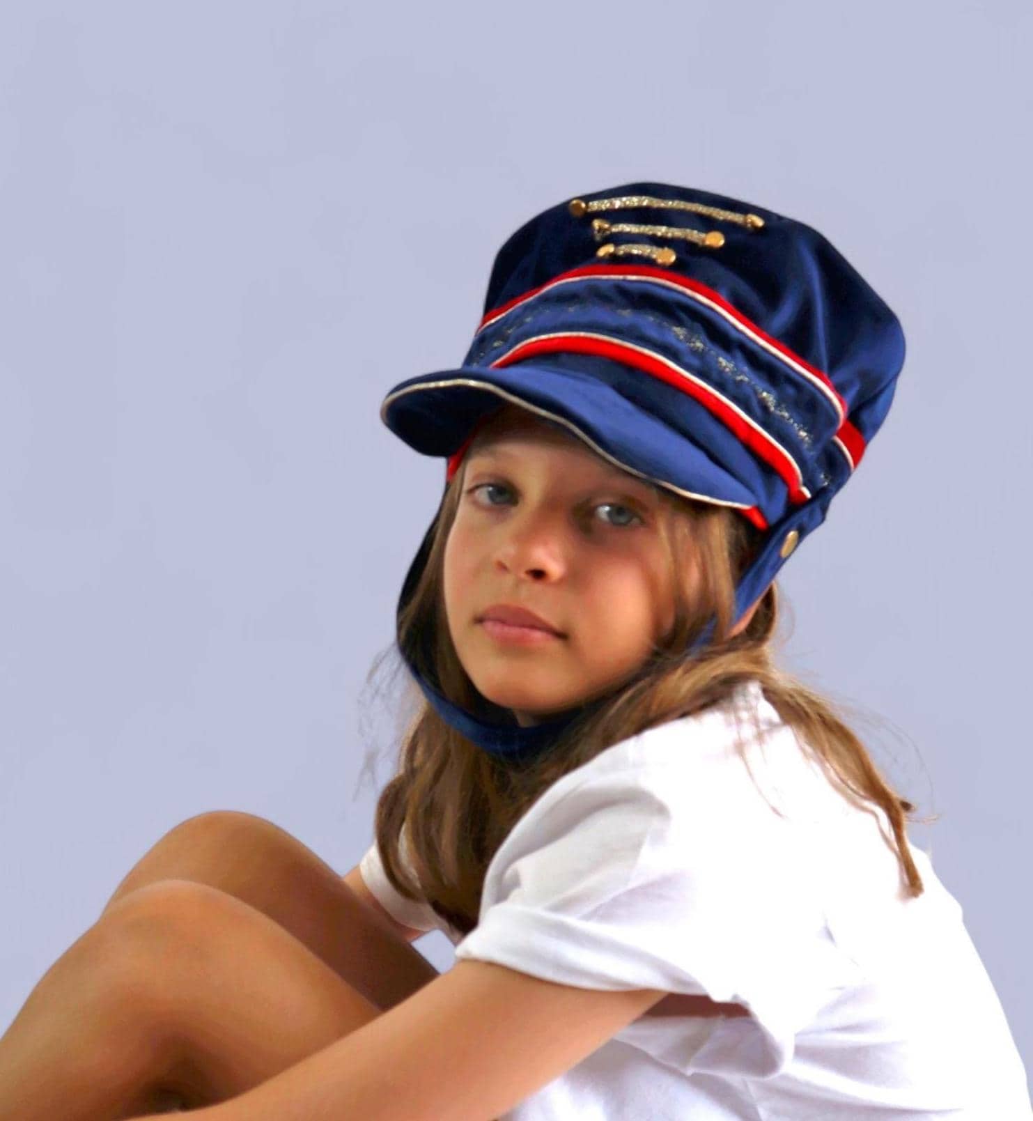 This Nutcracker-inspired hat is made from royal blue and red velvet, with a bright red satin lining. An elastic band inside allows for adjustable sizing, offering a comfortable fit.