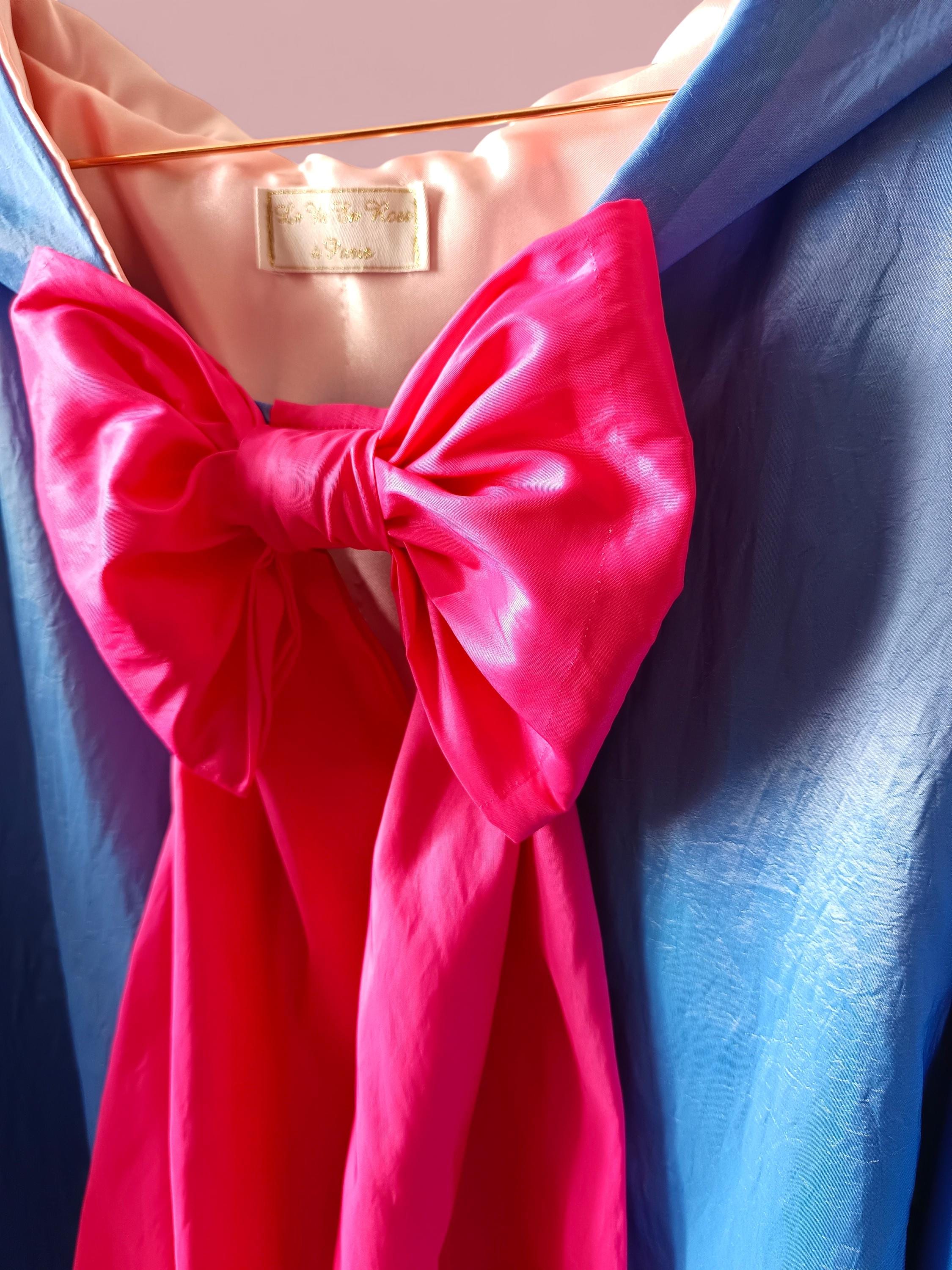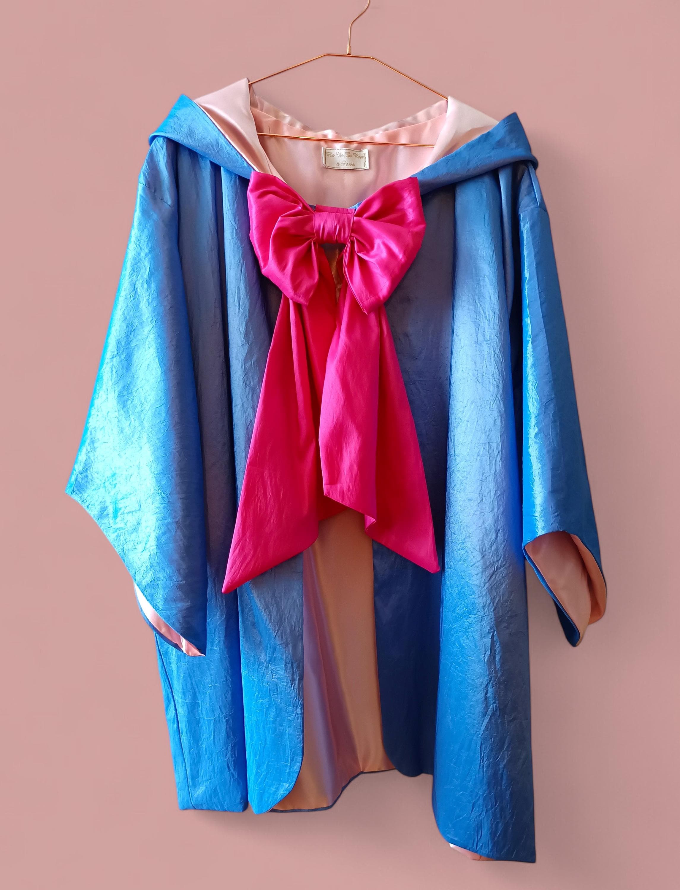 Made with shimmering blue taffeta, lined with soft pastel pink satin, and finished with a large fuchsia bow, this cloak brings the enchanting touch of Cinderella’s Fairy Godmother to life.