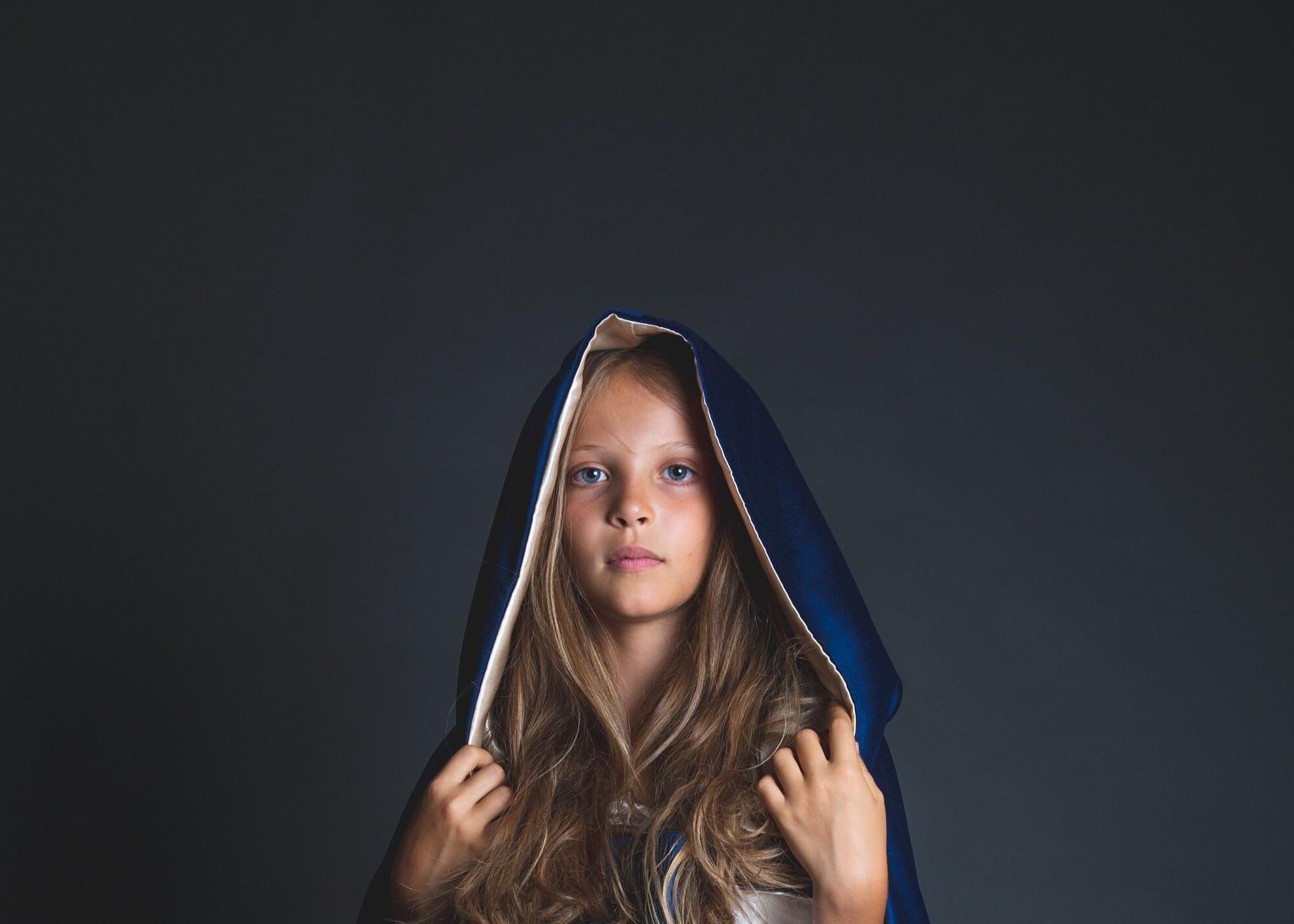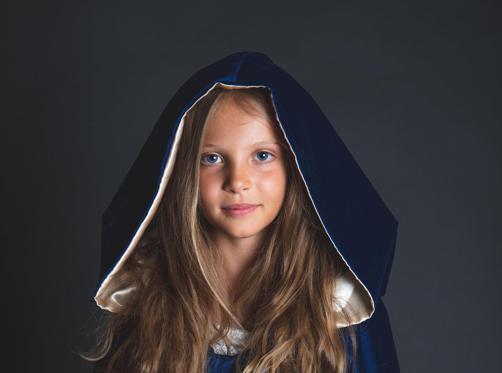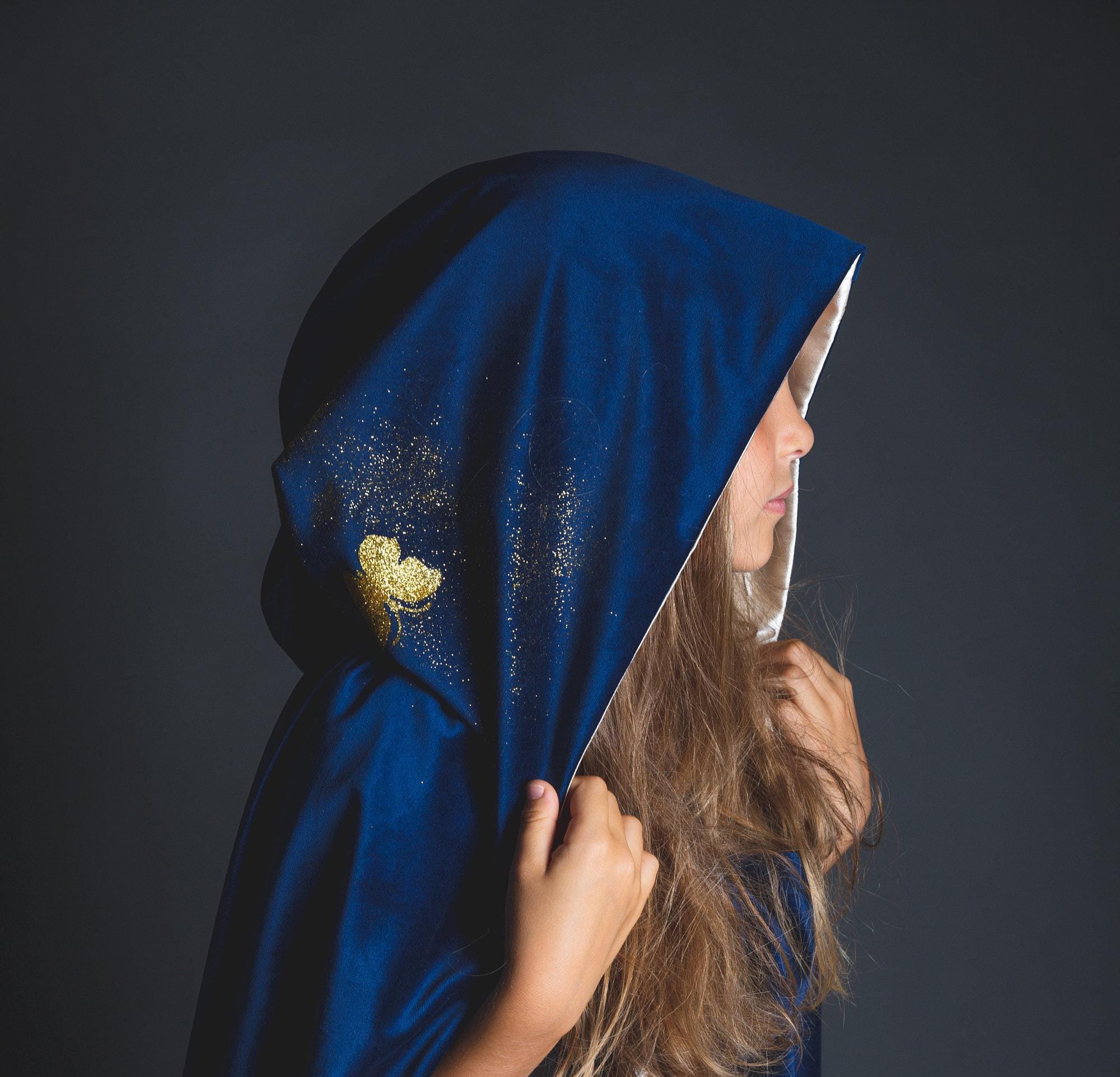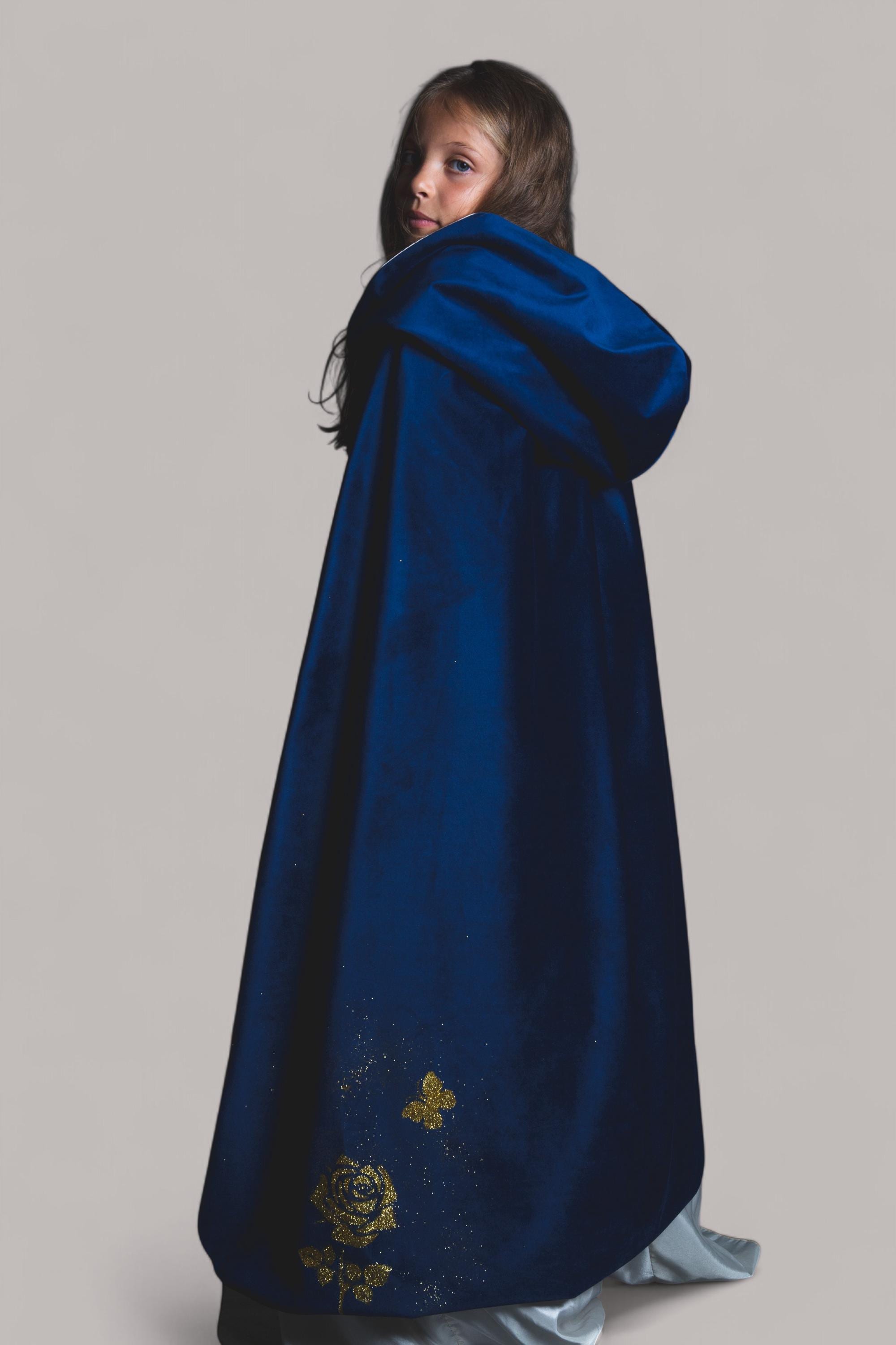 This enchanting cape, made from deep blue velvet and fully lined with ivory satin, brings together fairytale elegance and medieval charm.
